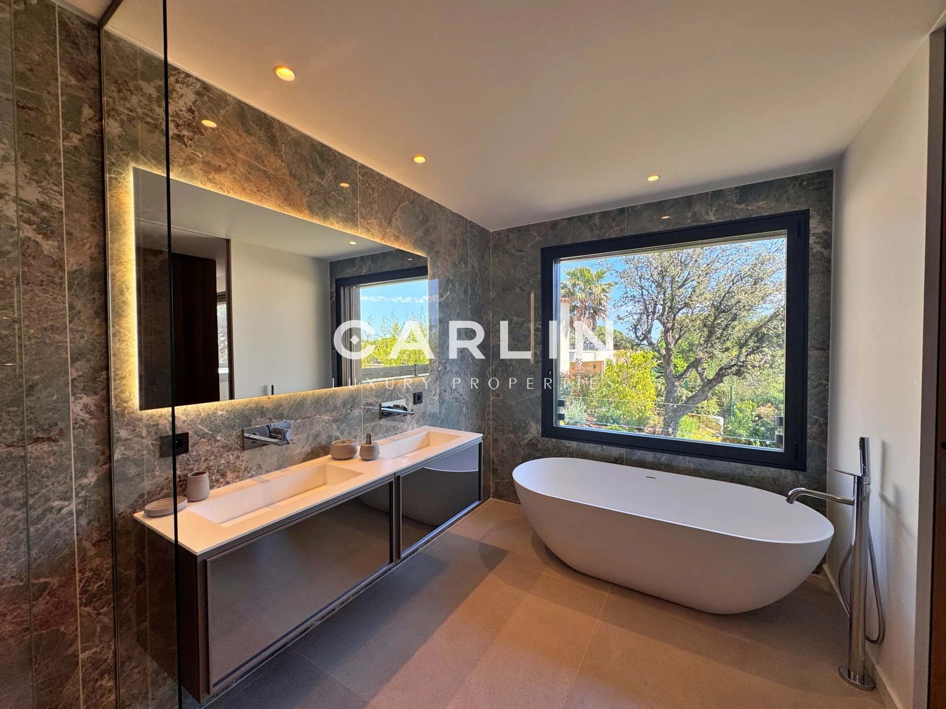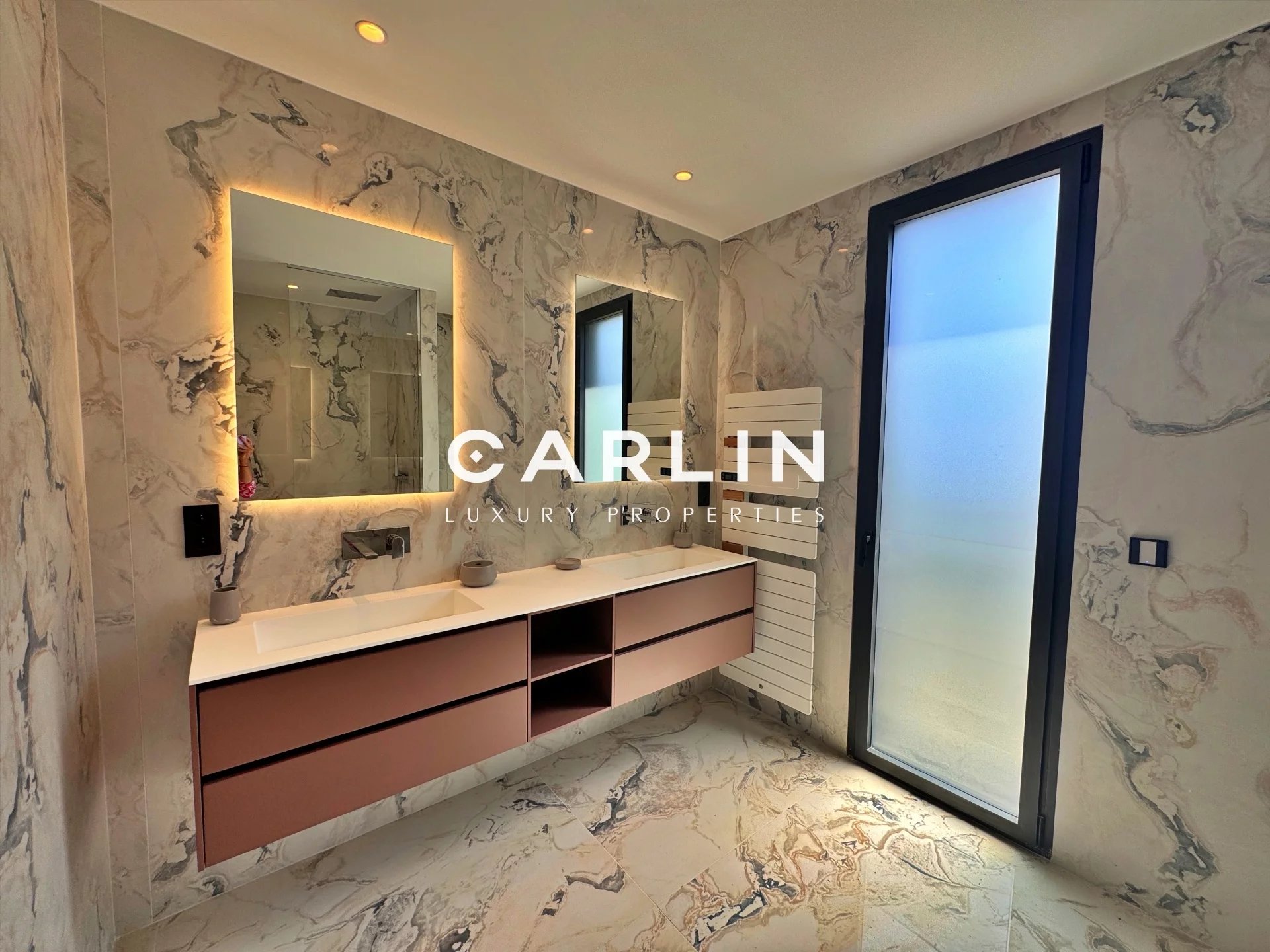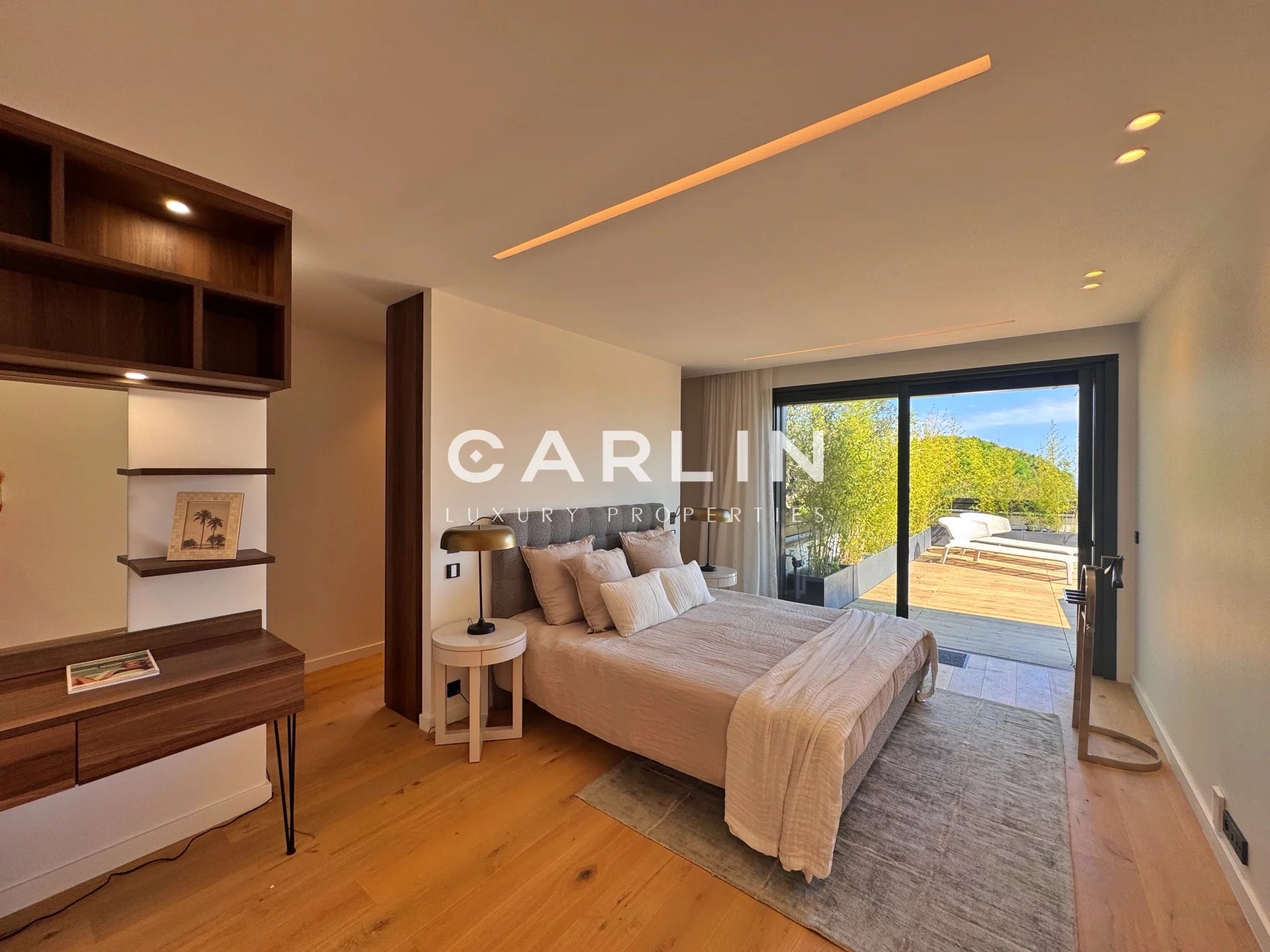 L’extérieur est une invitation permanente au bien-être : le jardin paysager, méticuleusement aménagé avec des essences méditerranéennes, entoure une sublime piscine à effet miroir, dont les reflets changeants épousent le ciel azuré.
