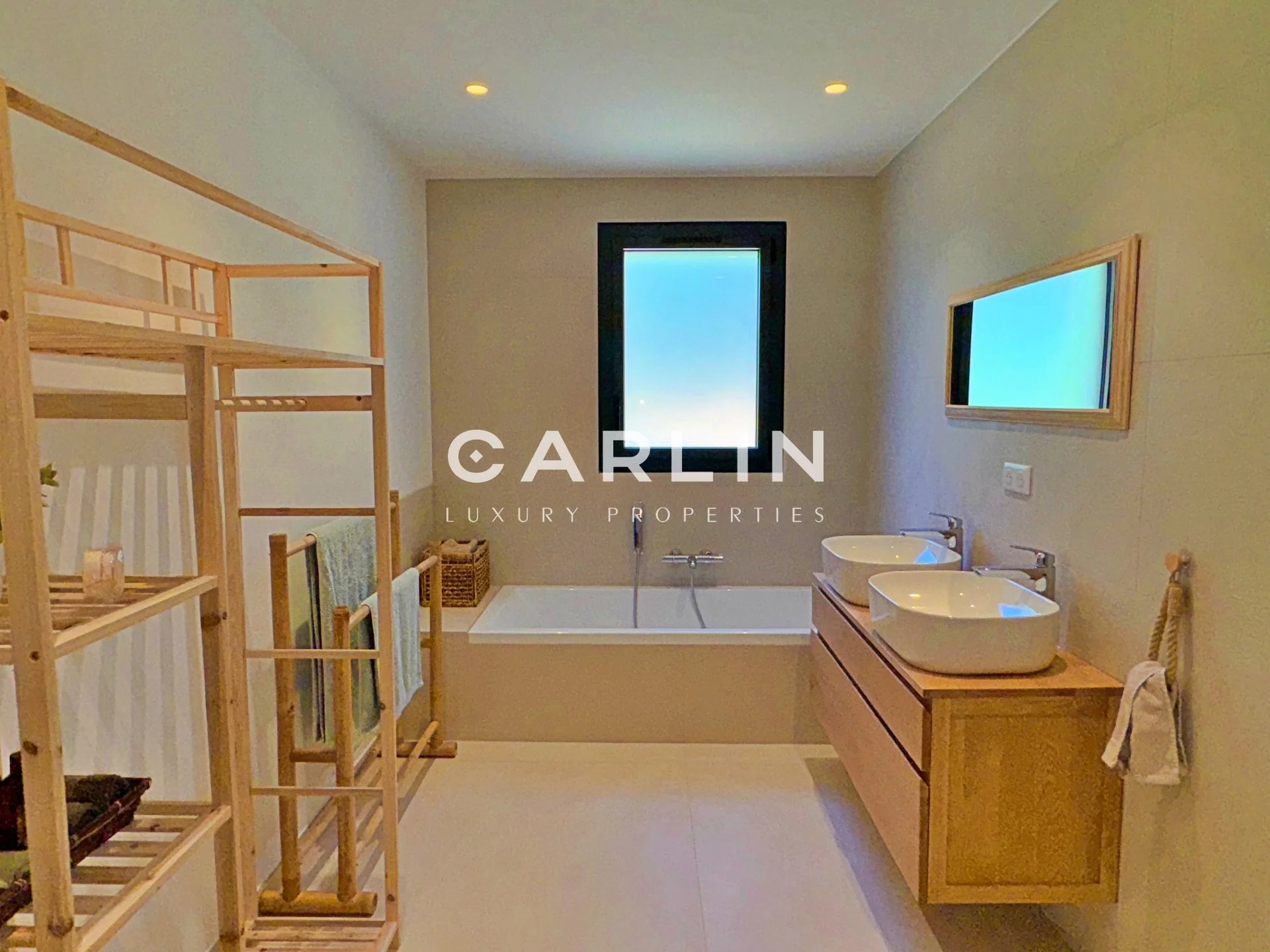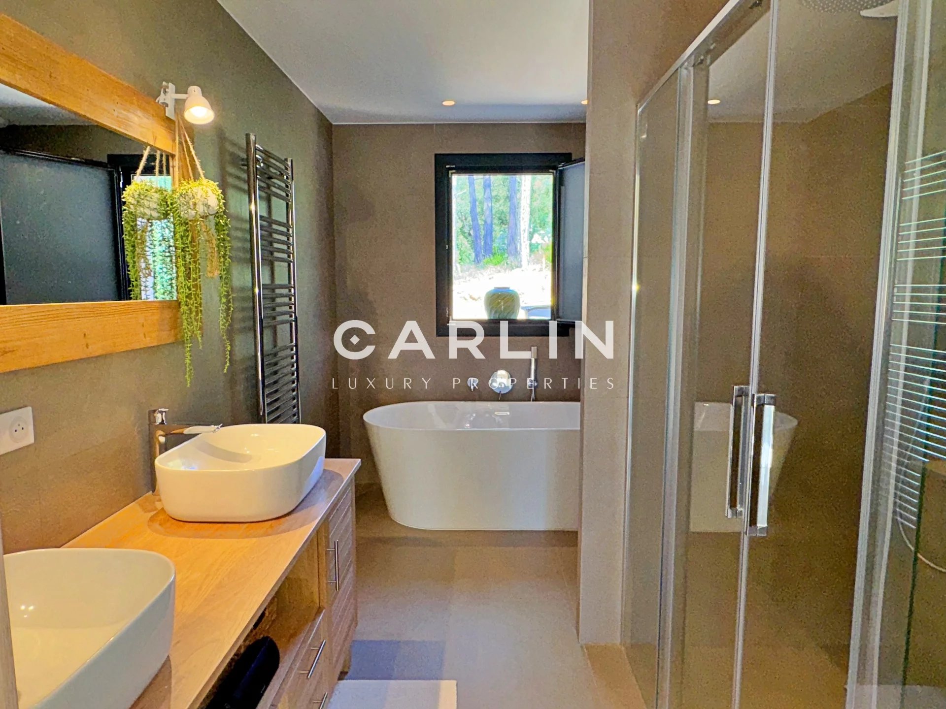La villa propose également de plain pied un bureau, une master, avec dressing et salle de bains complète (baignoire, double douche à l’italienne, double vasque, WC), offrant tout le confort moderne.