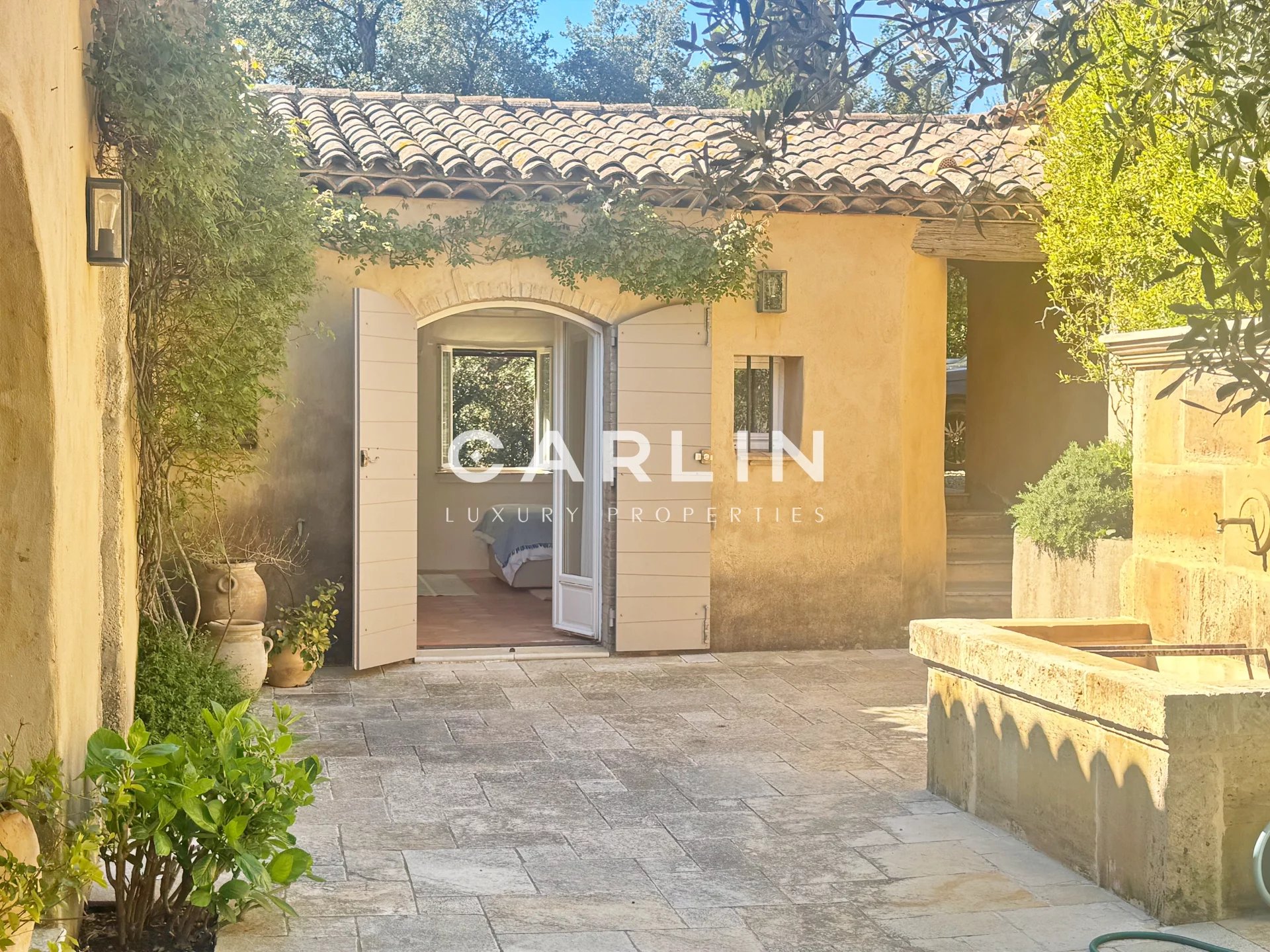 patio d’entrée, véritable havre de paix, sublimé par une fontaine en pierre et un majestueux olivier, symbole du charme méditerranéen.